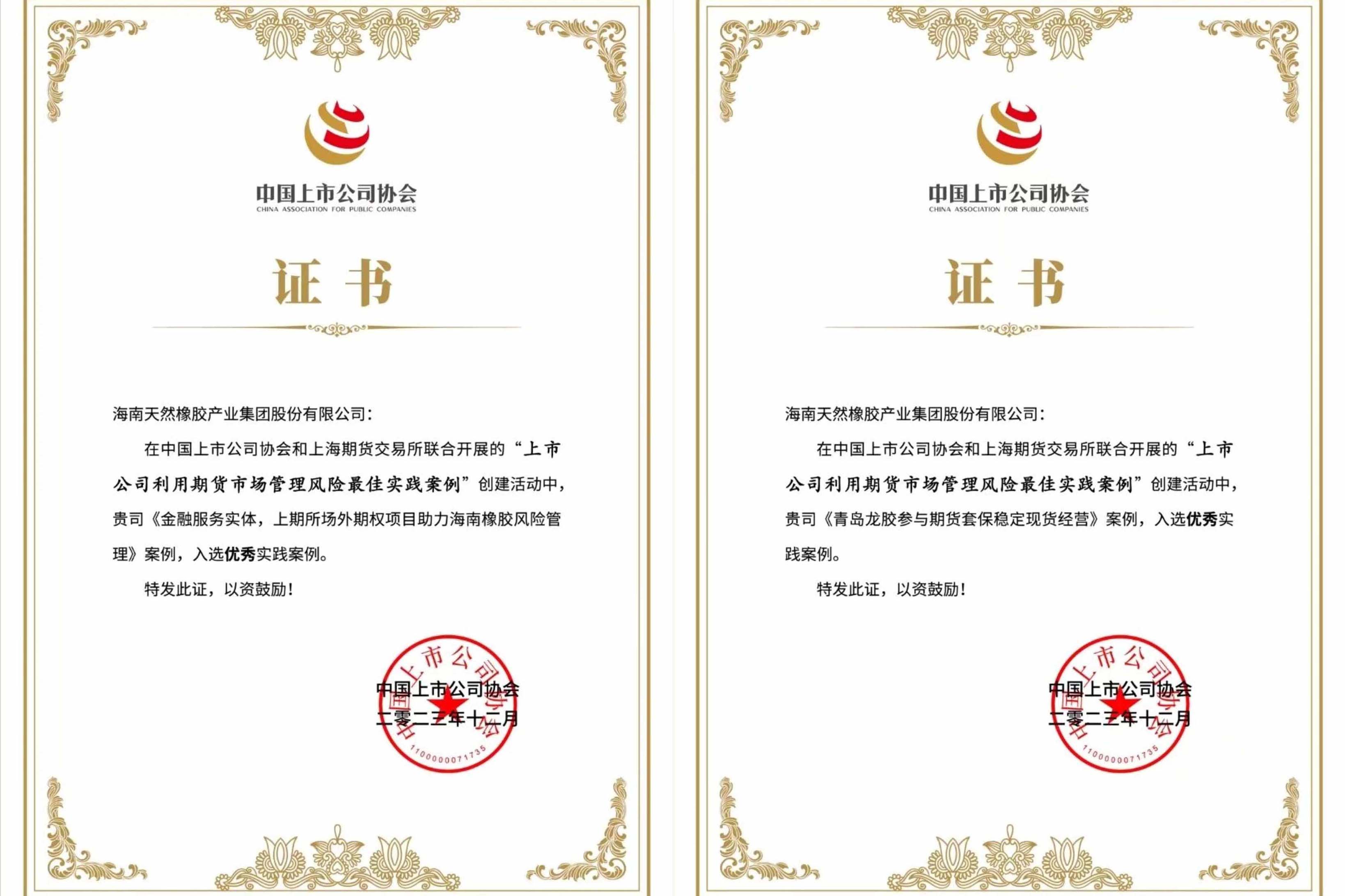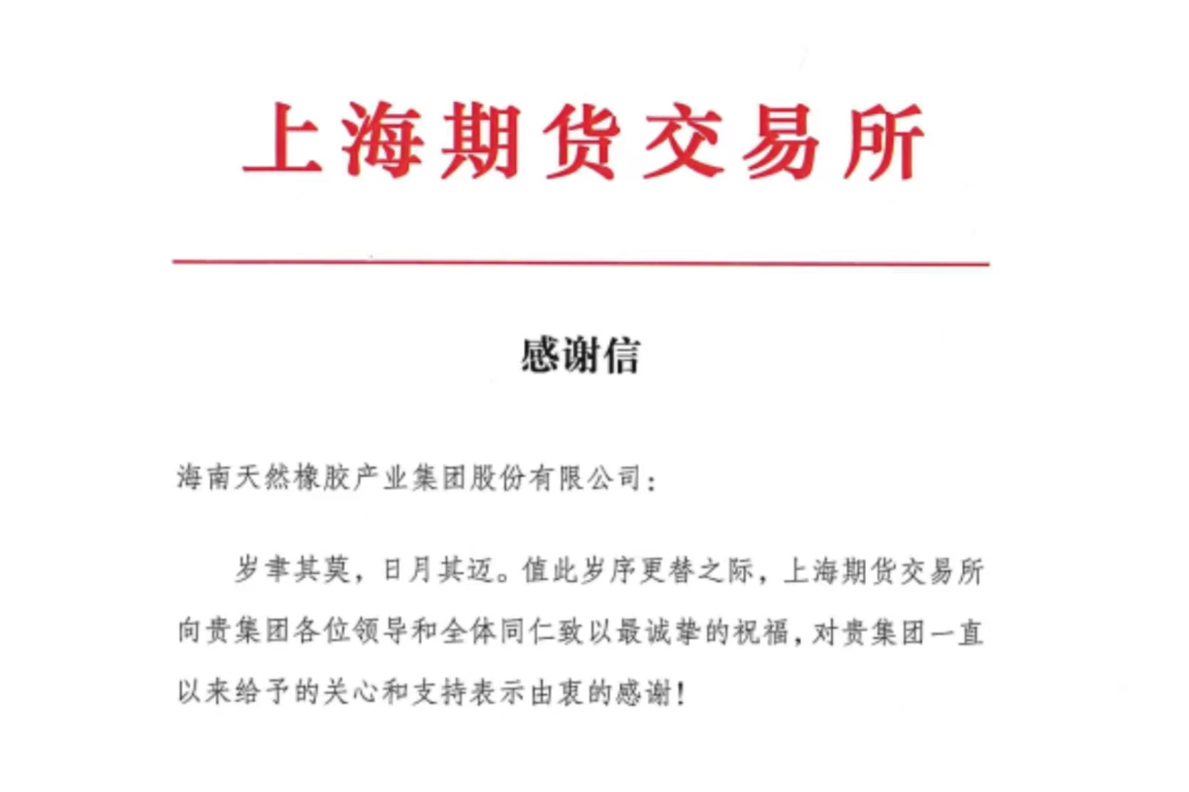 近日,海南橡膠收到一封來自上海期貨交易所的感謝信,信中對海南橡膠在天然橡膠期貨功能發揮、產融服務基地建設、20號膠期貨“豐羽行動”、能源化工產品委員會工作等方面給予的高度重視和支持表示感謝。