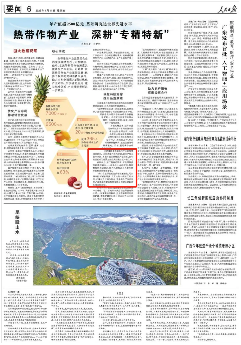 4月11日,《人民日報》要聞版刊發《熱帶作物產業 深耕“專精特新”》,重點提及海南橡膠的智能割膠機研發成果